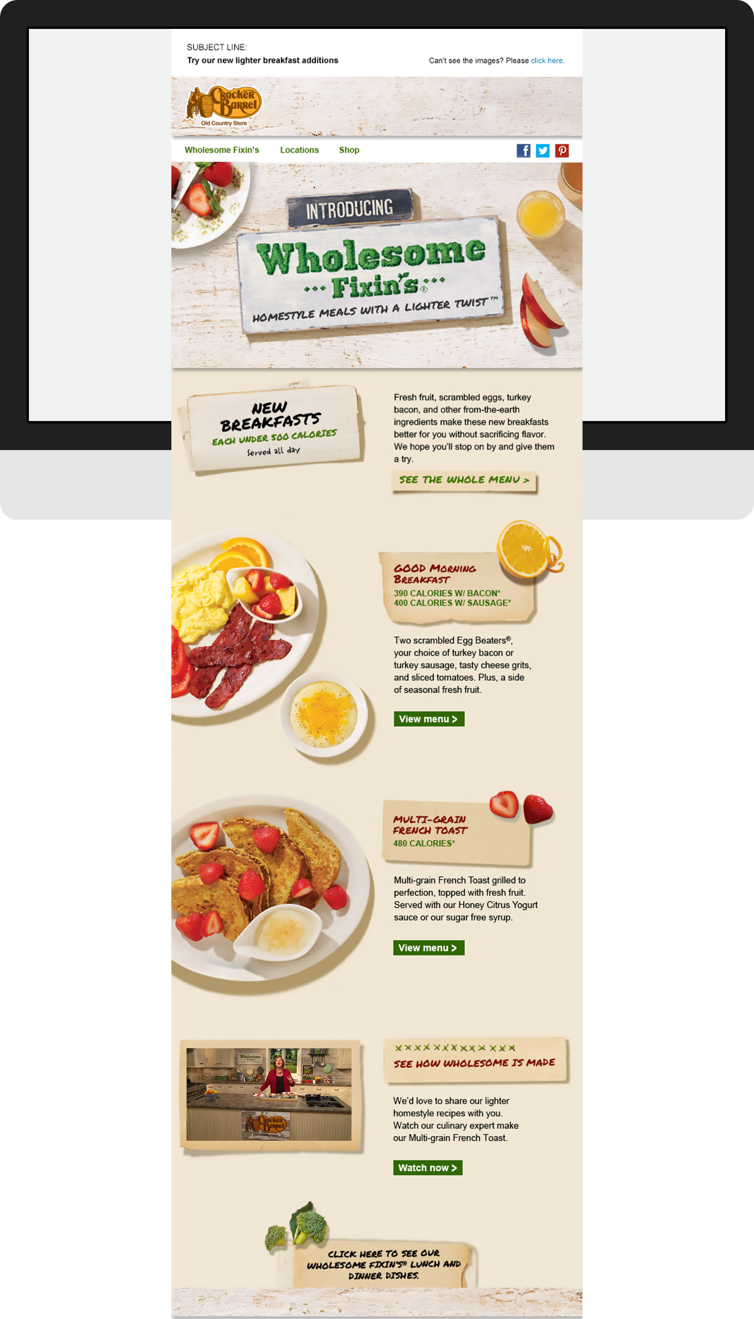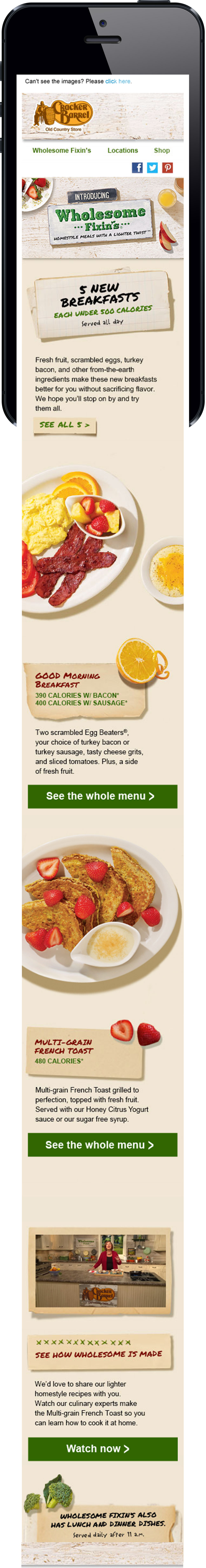 As we approach a new era of health, restaurants have started to serve healthier foods as well as display calorie count. In order to stay ahead of the competition Cracker Barrel challenged us to release a campaign that showed how their new lighter, better for you foods can still be wholesome.
